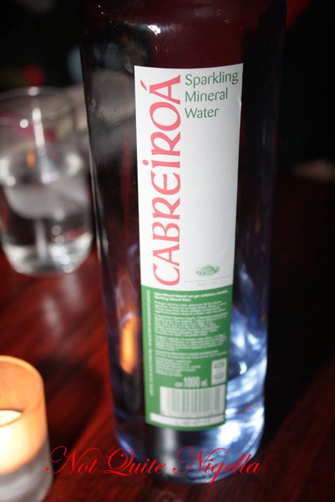 The walls inside are scrawled with French sayings cataloging the propositions from one staff member to the other. One such phrase translates to "Before you leave, will you sleep with me?". On one wall plays a black and white movie and above us, music plays although it's still easy to talk. Diners sit in Philippe Starck Ghost chairs and I take this opportunity to convince my husband that we need some in our new place. They bring out a large bottle of Cabreiroa Spanish mineral water.