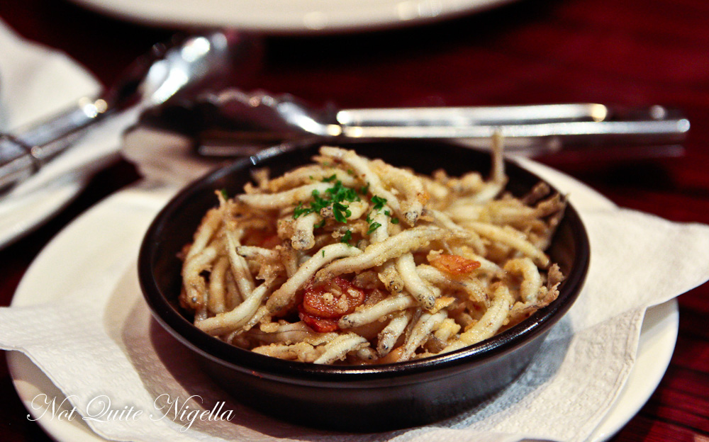 The West Coast whitebait is sauteed in olive oil with garlic and they're tiny little things that are tender with an appealing lick of garlic oil.