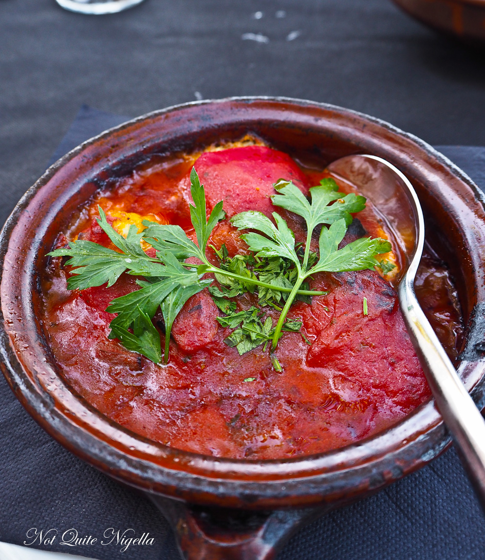 I take a spoonful of the red peppers filled with cod or bacalao. I don't expect to fall for this dish but I do resoundingly. It's a simple dish made with pickled red peppers and filled with a cod filling not unlike a croquette filling that Kate explains to me how to make. It is absolutely divine, the cod wonderfully creamy inside the peppers.