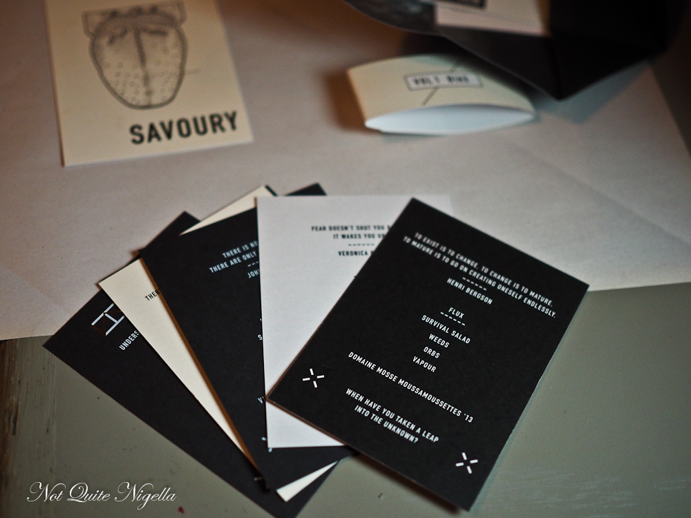 On the table is a mound of green sprinkled fairy floss and they hand us a square black packet which are to open. This will reveal the ideas behind the night as well as a cryptic menu served up as a series of cards. Nothing is what it seems as our brows furrow as we sift through the cards. Everyone else murmurs questions to each other and it certainly has many puzzled and curious.