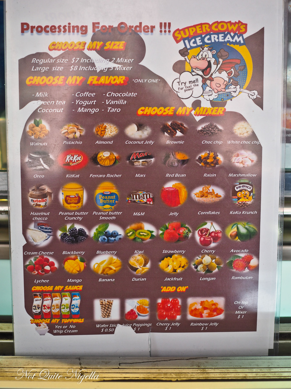 Outside is a man giving out menus. The crowd outside is a mix of the queue and those who have ordered and are waiting for their ice creams. We step across the threshold, a sign saying "No lickout laws here," and look down. There are said to be almost 12,000 bronze 2 cent coins embedded in the entranceway. JY and I visited on their second night although the queue seems worse than it is and we get our ice creams in around 5 minutes.