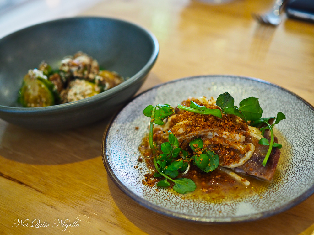 Each course comes out separately and we start with the devilled eggs topped with pickles and fermented chilli that is altogether familiar yet a novel take on a devilled egg.