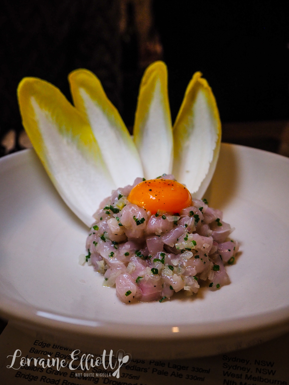 The first item to come out is the raw broadbill or swordfish with sour onion, chives and raw egg yolk. We are instructed to mix it up and spoon it on the witlof leaves. Like a beef tartare, it's creamy gorgeous with the seasonings and mix-ins the key to flavour. It get crunch and bitterness from the witlof.