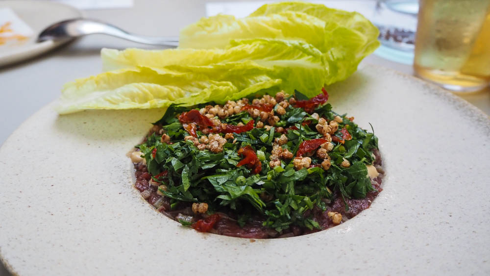 The lamb nayyeh is raw, finely chopped leg of lamb with a creamy, whipped sesame butter, topped with a deconstructed tabbouleh and served with cos leaves with a lovely fine crunch in each bite.