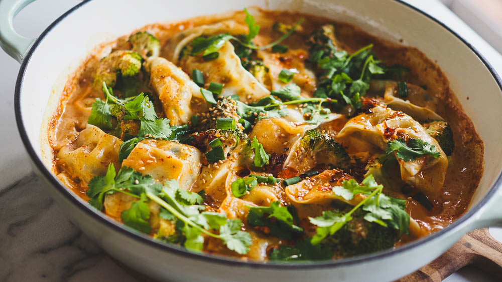 These baked Chinese dumplings are a fantastic one pan dinner. Frozen dumplings are baked in a creamy Thai red curry coconut sauce with broccoli or whatever vegetables you like. Super easy to prepare, great to serve with rice or noodles and perfect for busy weeknights or meal prep!