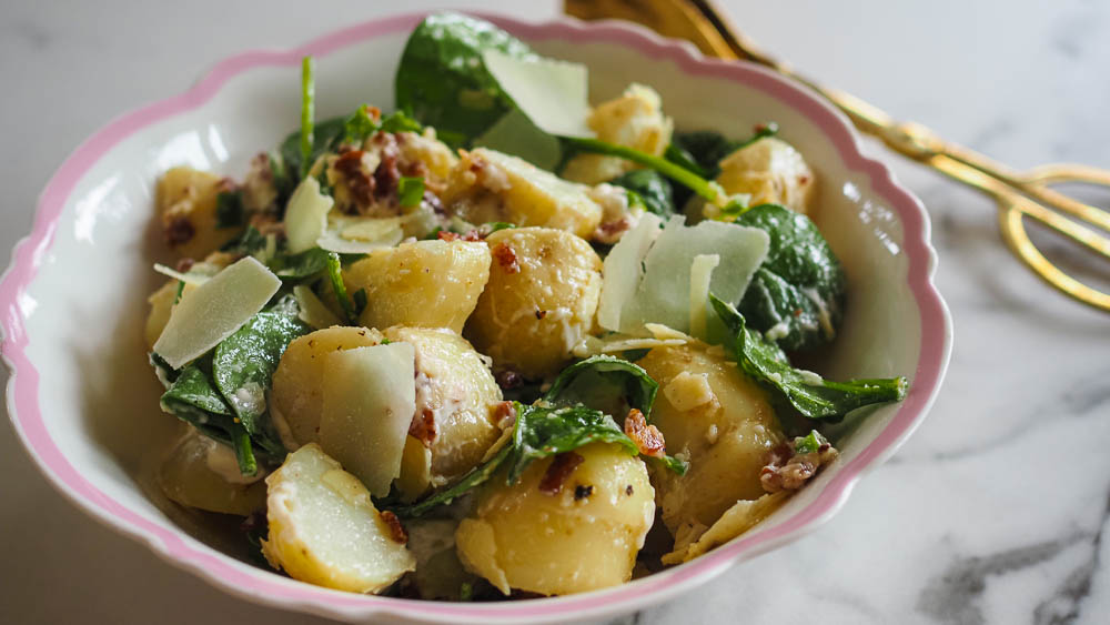 Do we really need another potato salad recipe? Honestly I wasn't sure if I should share this but it's so good that I had to. This potato and bacon salad is made with delicious garlic confit, baby spinach, shaved parmesan and a oil and mayonnaise based dressing. It has to be tasted to be believed. Served hot, warm or cold, it is utterly divine. I've got another potato bacon salad recipe with corn here too.