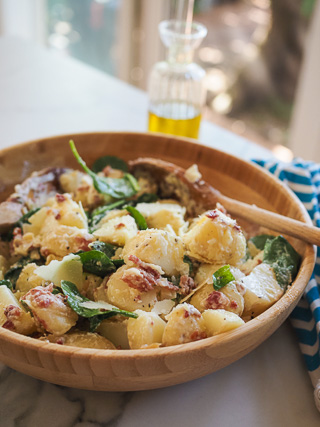 Step 4 MIX - Add the bacon to the potatoes along with the baby spinach, green onions, confit garlic cloves and most of the shaved parmesan (reserve a little to sprinkle on top).