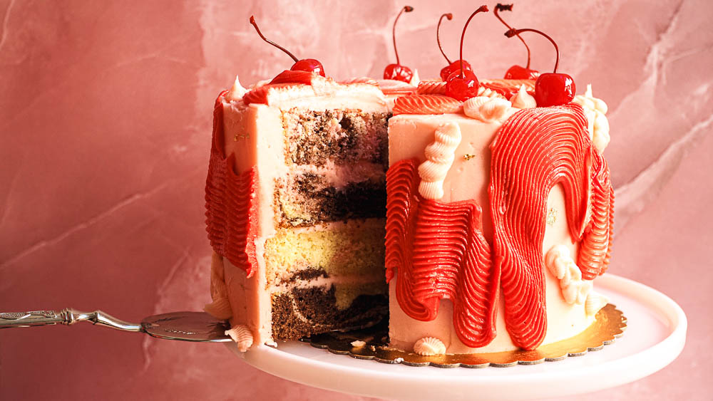 This classic Neapolitan marble cake combines strawberry, chocolate and vanilla swirls. It's buttery, moist and topped with pink buttercream. It's the perfect show stopping birthday cake with a retro twist!