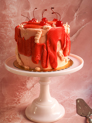 Step 9 DECORATE- Tint the remaining buttercream with red and mix. Fill the piping bag and tilt the cake carefully and pipe a waterfall pattern on the side. I also filled a small piping bag fitted with the 47 small basket tip and piped some pink dabs. Add the maraschino cherries on top. This can be stored, covered at room temperature.
