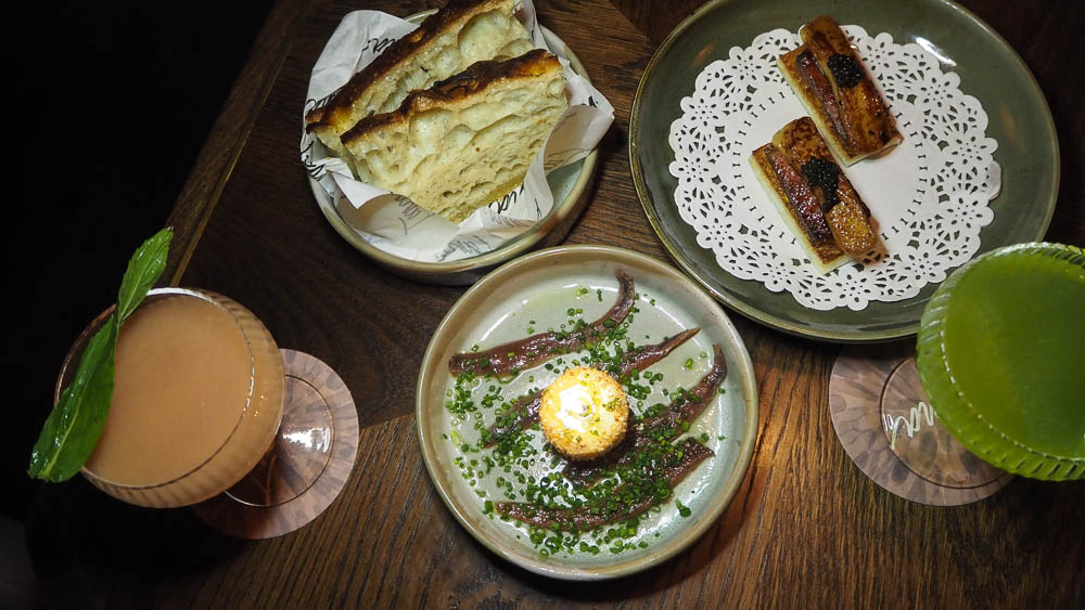 One of the dishes that is coming in December just in time for Christmas is the cultured quail tallow "butter candle" rolled in crispy chicken skin and roasted rice crumb that is served with the focaccia. This is served on a bed of Ortiz anchovies and the idea is to wait until the candle melts and then dip the focaccia into the melted tallow. It's wonderfully umami and it's a perfect bite when you get some of the quail skin crumbs, rice powder, anchovy, green onion and lots of the melted tallow.