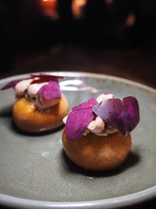 The duck doughnut is one of the most popular snacks and features a fried bao stuffed with confit duck, Davidson plum sauce, plum ketchup served with a squiggle of cultured quail parfait and garnished with oxalis or wood sorrel leaves on top to balance the rich doughnut with a light acidity. The parfait is light and blends in well with the other ingredients without a hint that it is grown in a factory.