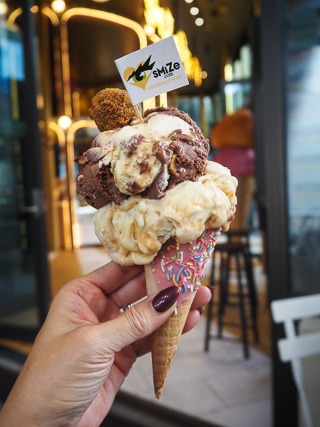 The ice cream, on the verge of tipping over, is rich and creamy and this is best tackled by up-ending it and putting it in a cup. I had ordered it with an extra pink dipped chocolate cone with sprinkles which is $2.80 extra plus the two flavours I liked which happened to be premium flavours with the SMiZE surprise ended up at $19.30 for this double cone. "Tyra's Favourite" is made with ribbons of thick salted caramel, butter-roasted pecans in a rich salted sweet cream and it's the saltiness that balances the rich cream and caramel that I really enjoy. I also really enjoy the Dubai style chocolate dark and white chocolate ice cream swirled with pistachio cream and crunchy kataifi and their house made pistachio brittle. The pistachio brittle really ends up taking the Dubai chocolate bar ice cream to the next level. The SMiZE surprise is like cookie dough ball rolled in crumbs adds a bit of texture to the ice cream. It's not strictly necessary but it's just a bit extra on the top.