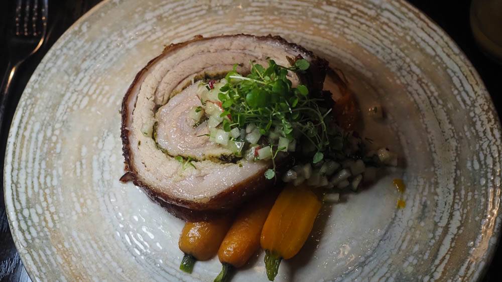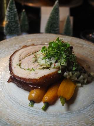 The roast porchetta is served as an inch thick slice of herb rolled pork belly with caramelised carrots and a finely diced peach & tarragon salsa. The porchetta is made with Australian free range boneless pork belly and seasoned with salt, pepper, ground fennel and celery salt. After it is trussed and it is slow cooked for six hours before a high finish to crisp up the skin. The pork is tender and juicy with a crackling like a suckling pig's glass crackling.