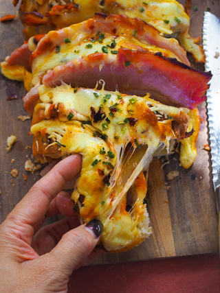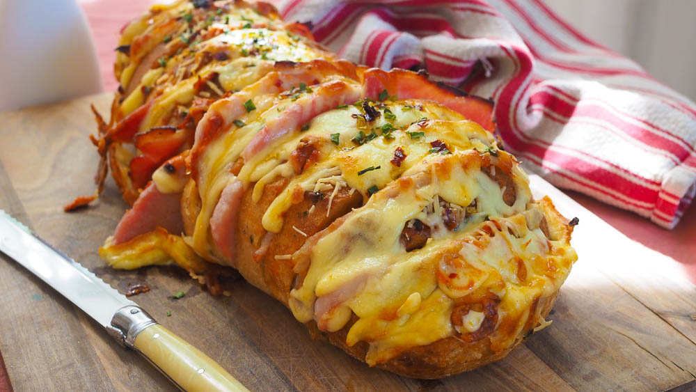 Ok hear me out. Garlic bread for New Years Eve parties is the best kind of garlic bread. For this bread we add sliced Christmas ham with cheese, tomato pesto and chilli oil. Why have plain garlic bread when you can have loaded ham and cheese garlic bread?