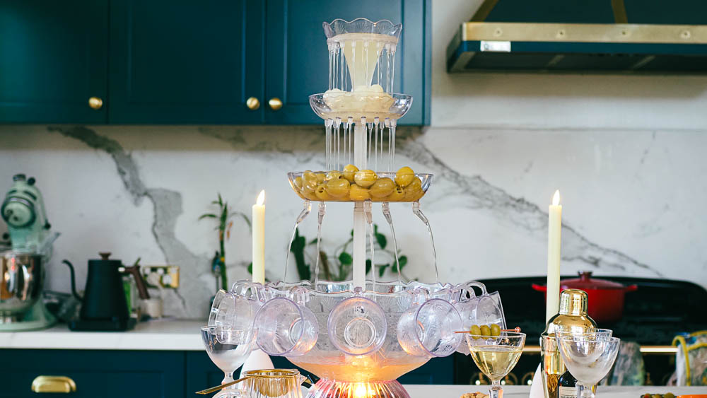 This martini fountain is a spectacular way to serve martinis for New years or for a party. The fountain mixes up the martini and then your guests can help themselves to a martini and add olives, cocktail onions or the olive brine to make their own martinis! I first saw this on join_jules on Instagram and fell in love with the idea!
