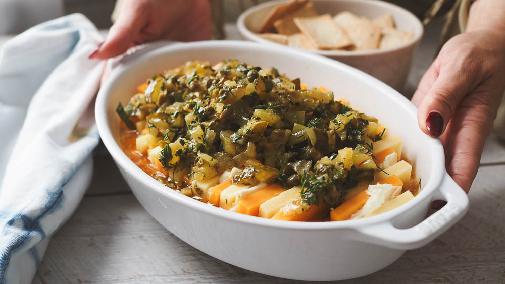 This marinated pickle cheese is the ultimate party appetiser and cheese platter alternative. Layers of red cheddar and gouda cheese are sandwiched with cream cheese then marinated in a tangy, herby pickle and caper dressing with dill, chives and a touch of chilli. The cheese absorbs all that briny savoury goodness so that it is even better the next day or even in 3 days! Serve with lavosh crackers for the best party app!