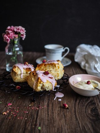 This is one of those sweet treats that I absolutely love just to eat myself. They're rose scented scones that feature small chunks of Turkish delight in them and are topped with rose pink icing and rose cream.