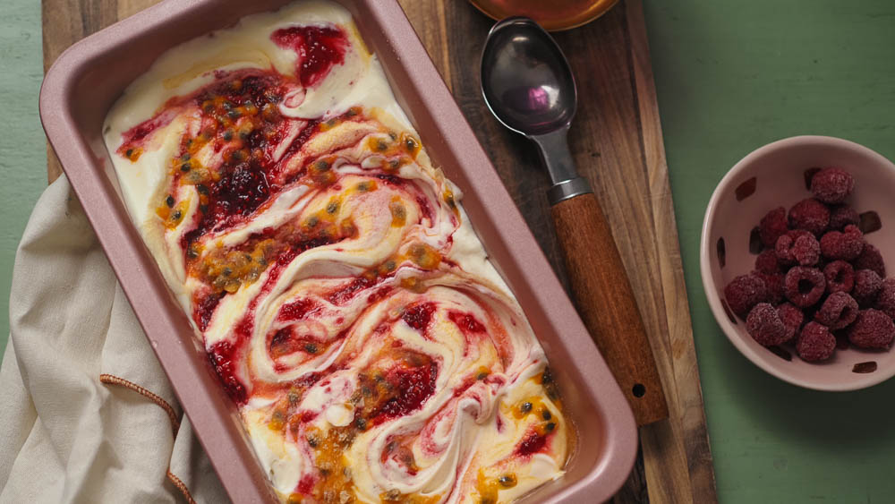 This raspberry passion fruit ice cream is a creamy, sweet, tangy dream made with just 4 ingredients. We use a super simple no churn ice cream base (tip: this is great 2 ingredient ice cream to have up your sleeve) and ribbon raspberry jam and fresh passion fruit through it. The combination of flavours is so divine!