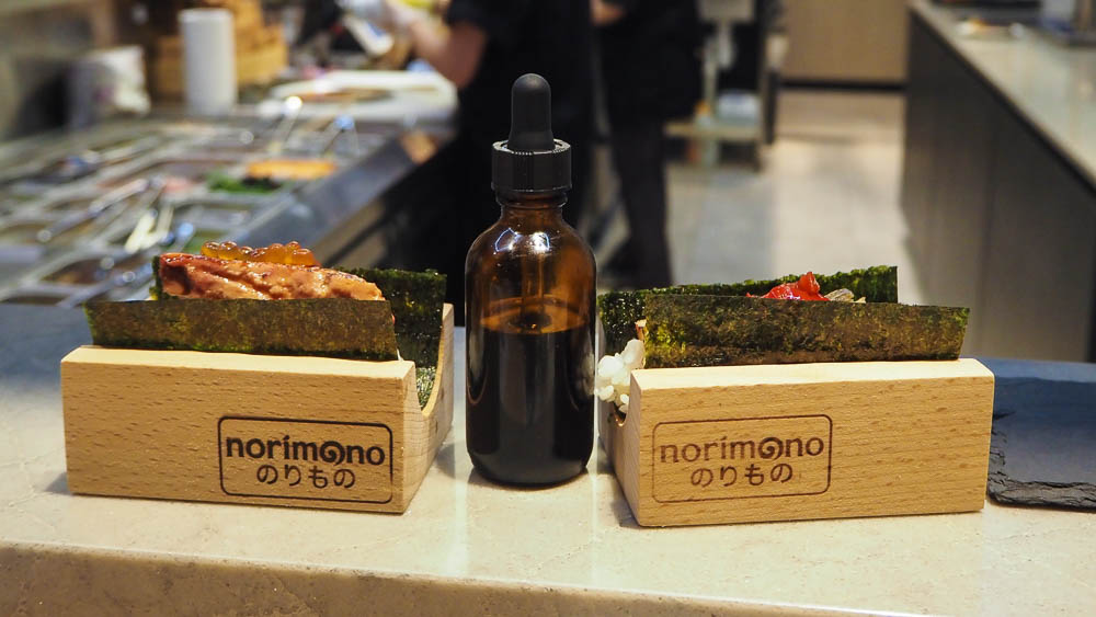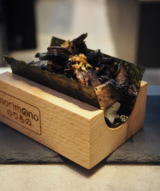 It's a rainy Saturday night when Sophia and I arrive at Norimono, a Japanese hand roll or temaki bar in Crows Nest. At 5:15pm the restaurant is full of people and we are glad that we have a booking. All of the seating is bar seating and there are two sections: the bottom section with Head Chef Hiro Kano (formerly of Besuto) and the top level, larger section which we are sitting at.