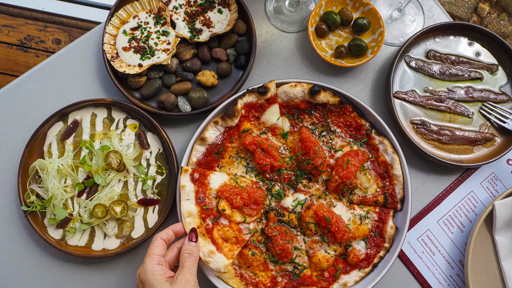 Start with the cocas or the Spanish pizza bread of which here are three varieties. We choose the Catalan with grated tomato, fresh cured cheese and oregano with some Cantabrian anchovies to season on top.
