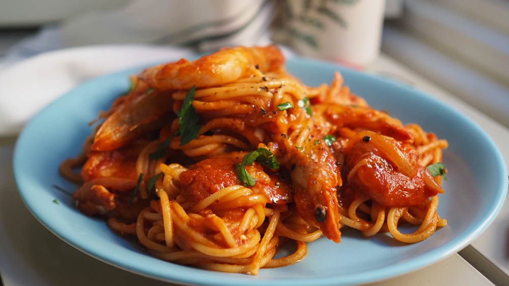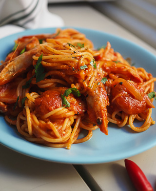 I make this so much that I often don't have to look at a recipe for it. It's just one of those super satisfying dishes that we love because of the chilli. Prawns are my favourite followed by Italian pork sausage because the sauce can go either way towards meat or seafood really.